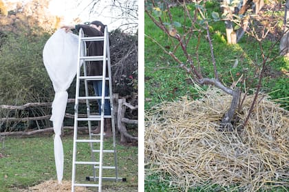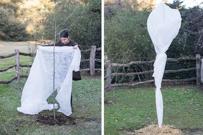 1 Forrar el tronco con tela antihelada con varias vueltas (al menos tres capas). Clavar tres o cuatro cañas del alto del árbol. Cubrir la base con pasto seco o chips de corteza.