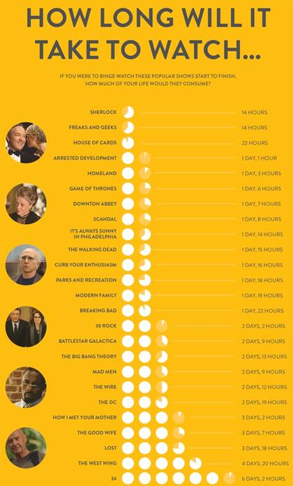 La cosa es que, atenta al auge de las tiras televisivas, la consultora Nielsen nos ahorró el trabajo y tomó las series de TV más populares del momento, y armó un cuadro bien simple donde nos muestra cuántas horas de nuestra vida deberíamos invertir en estar sentados frente a la pantalla para ver todas las temporadas juntas.