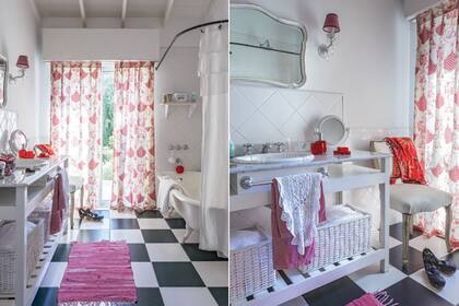 Estilo vintage romántico | En este espacio llama la atención el espejo con marco decapado y, por supuesto, el color, incorporado en los géneros de las pantallitas antiguas, la manta sobre la silla francesa tapizada en cuerina y la cortina de tela estampada. El vanitory fue diseñado a medida en madera laqueda con mesada en mármol.