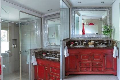 Con líneas orientales | El gran vanitory patinado impacta por su color y diseño, y se lo eligió para equilibrar la base moderna de este baño. La mesada es de mármol imperial con vetas marrones. Para completar el rincón se colocó un gran espejo con un marco artesanal de alpaca. El piso, por su parte, se revistió con porcelanato.