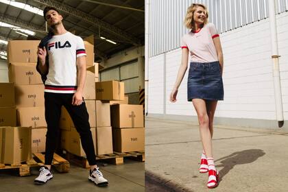 Para los más clásicos también hay opciones trendy este verano. A la izquierda un total look urbano de Fila con remera estampada, pantalón azul y zapatillas blancas con detalles azules y rojos. A la derecha, remera de algodón rosa con detalles en rojo y pollera de jean de Levi´s.