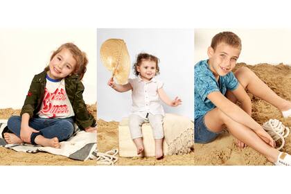 A la izquierda un look con campera militar con remera estampada y jeggings. En el centro un total white para el conjuntito de Wanama Boys & Girls y a la derecha un total look de Mimo con bermudas de jean, remera celeste con estampa de hojas y zapatillas súper cancheras ¡sin cordones!..