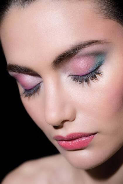 En la piel luminosa y satinada, como húmeda, se destaca el neón intenso en la boca y los ojos que se esfuman del fucsia al rosa suave.