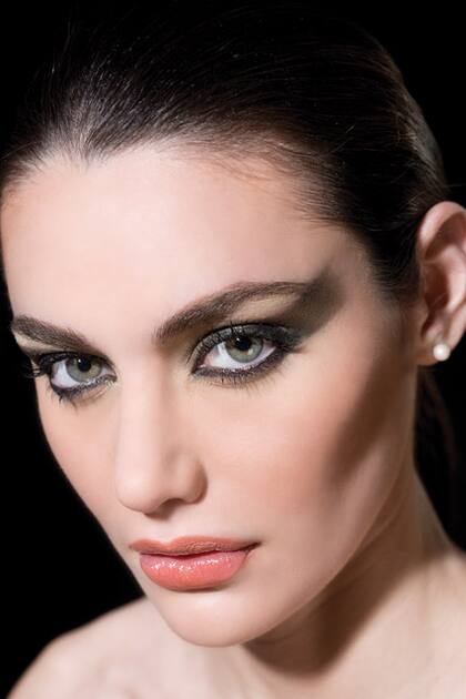 El look se enfoca en los labios donde se utilizan dos tonos de labiales, uno en el contorno y otro en el centro para lograr una boca bicolor. Los ojos acompañan en tonos suaves logrando una mirada luminosa.