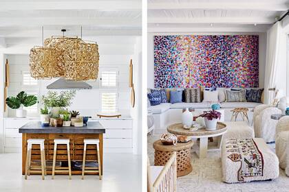 Desde la altura de las lámparas tejidas de manera artesanal hasta las mesas bajas, las fibras naturales tienen el tono justo para crear una base neutra que, como en este caso, deja lugar a atractivas pinceladas de color.