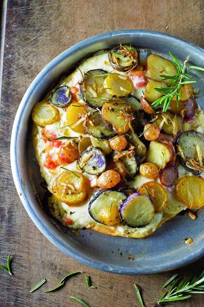 Colocar sobre la masa, en este orden: parmesano, tomate, sal, albahaca, mozzarella y, por arriba, los papines cocidos y salteados.