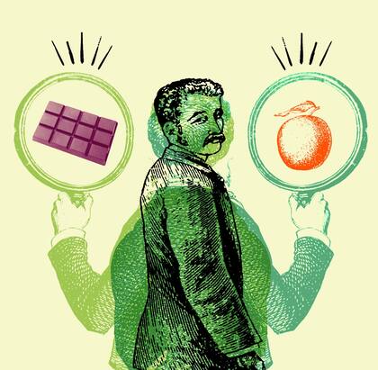 Resulta interesante observar que cuando la decisión sólo involucra el futuro tendemos a tomar decisiones correctas. Shlomo Benartzy, especialista en conducta financiera, llevó adelante un experimento esclarecedor. Ofreció a un grupo grande de personas la alternativa de elegir si una semana después querrían comer frutas o una barra de chocolate. En ese escenario, 74% eligió la alternativa saludable. Sin embargo, cuando a un grupo similar se le ofreció la disyuntiva inmediata, qué elegir para comer en ese momento, ¡70% eligió el chocolate! Es fácil hacer lo correcto cuando, después de todo, el que va a tener que sobrellevar la menor gratificación es el yo futuro. La dificultad de autocontrol no es un problema en las decisiones lejanas, sino en las presentes. Un dato curioso: ¡la opción elegida para la semana siguiente se vio afectada por el grado de hambre de la persona en el momento de decidir!