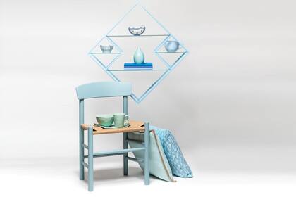 CELESTE | Almohadón con borde rústico ($499, Falabella); almohadón estampado ‘NYC’ ($495, Bretaña); silla de estilo nórdico laqueada ($6.800, Broca); bowl ($79,90) y taza ($99, todo de la línea Juliana López May de Falabella); biblioteca de metal en forma de rombo ($3.025, Good Wood); maceta ‘Fausto’ con oso pintado ($160, Oma Objetos de Cerámica); tazón ‘Rainy’ con motivo de gotas ($170, Bretaña) y florero de boca angosta ($69,90, Falabella).