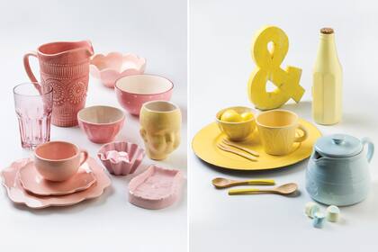 ROSA | Taza de té con plato irregular ($249) sobre plato grande del mismo juego ($199); vaso de vidrio rosa translúcido ($145); jarra de cerámica con relieve ‘Sol’ de 1,25 lt ($390, todo de Reina Batata); bowl con borde redondeado ‘Loto’ ($330, Salmón); bowl con pintitas ($120, Mr. Aldus); compotera con interior blanco ‘Lulu’ ($220, Ibar Cerámicas); cazuela con contorno irregular ($74, Reina Batata); jabonera en forma de lechuza ($190, Bretaña) y maceta amarilla ($200, Ibar Cerámicas).
