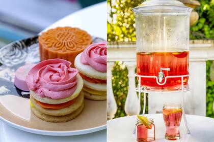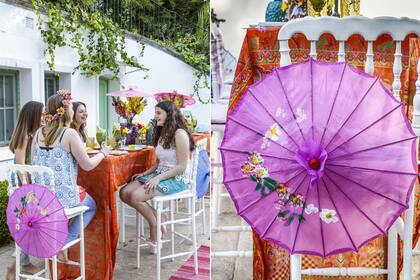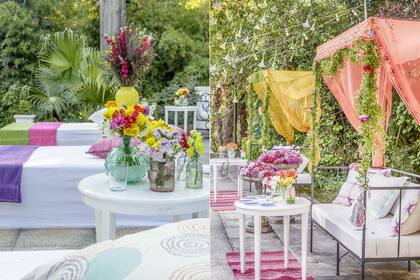En lugar de mantel, Ramiro vistió las mesas con pañuelos, pashminas o retazos de género liviano con motivo hindú y, por lo tanto, muy colorido. Todo en sintonía con la paleta floral de colores plenos y contrastantes. Un detalle de las masitas (Petite Patisserie) de inspiración veraniega, al igual que los jugos y licuados sin alcohol que propuso Fashion Drinks.