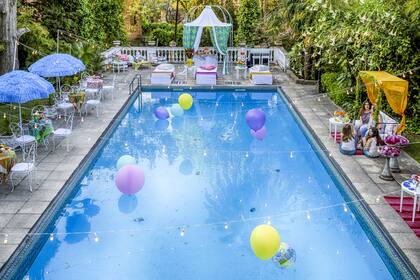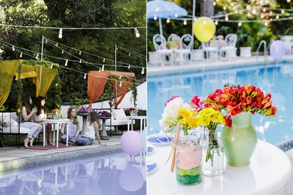 Decoración que se convertirá en juego si el tiempo acompaña: pelotas de plástico y piñatas hechas con grandes globos de helio que se mantienen estables atados a un peso en el fondo de la pileta. "Compré los globos en un cotillón. Con dos garrafas de helio descartables ($600 c/u) podés inflar hasta diez de gran tamaño", nos cuenta Ramiro. Alrededor, mesas, sillas y camastros de hierro alquilados (Te Armo el Living).