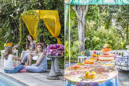 Color y más color. Si los 15 años son el símbolo del pasaje a la juventud, las flores frescas son el adorno más indicado. La consigna: simples y de estación (en este caso fueron fresias, conejitos, alstroemerias) en ramos informales (Fabiana Brouet y Florencia Boero), sin la rigidez de oasis ni alambres ni la solemnidad de los arreglos monocromáticos. Enfrente, la mesa dulce (Petite Patisserie) sigue con la idea. Los tops de las chicas y el pantalón de seda rayado son de Rapsodia.