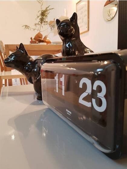 El tradicional reloj de aeropuerto con sistema flip, en versión de hogar: con sistema analógico y un sistema silencioso, tiene estructura de plástico y piezas de metal. Viene en blanco y negro, mide 26 cm de ancho y se puede usar como reloj de pared o de apoyo. Se consigue en Tienda Palacio.