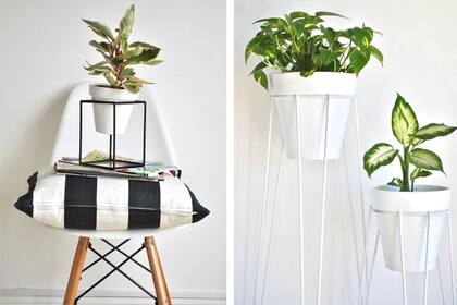 Para despegar a las plantas del suelo y darles vuelo propio, los maceteros con base de hierro son una opción que queda bien en interiores y exteriores. En Alegra Deco & Garden hay varios modelos en diferentes medidas, con patas y para apoyo sobre mesas o estantes. Vienen con una maceta de barro esmaltada en blanco o negro.