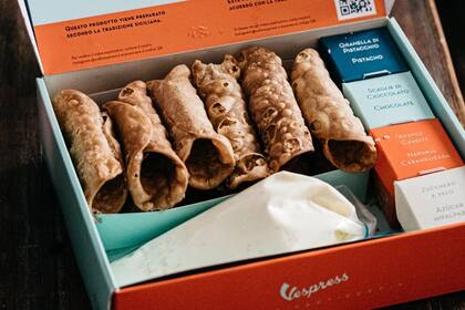 La sfogliatella que ofrecen, típica de la cocina de Nápoles, es una delicia, con un hojaldre delicado que esconde un relleno de crema pastelera o de crema pastelera y nutella. Pero el best seller de la casa es claramente el cannolo (singular de cannoli), una especialidad siciliana. Es una masa frita, ligera y delgada, que se debe rellenar en el momento de comer para mantener su textura crocante. Por eso, la caja de Café Vespress incluye los cannoli por un lado y una manga con el relleno elegido por el otro: está el clásico de ricota y uno más goloso de crema de dulce de leche. A esto se suman tres toppings para adornar los bordes del cannolo: chocolote picado, pistachos y naranjitas confitadas. Y suman azúcar impalpable para espolvorear por encima. No sólo todo es muy rico sino además muy bello. Una gran idea para la merienda propia; aún mejor para un regalo que será muy bienvenido.