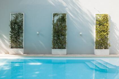 En un lateral de la piscina se colocaron planteros en chapa esmaltada a fuego en blanco, con un sistema de guías metálicas para las plantas (diseño del estudio Alfred Fellinger). Los artefactos de luz son de Iluminación Agüero
