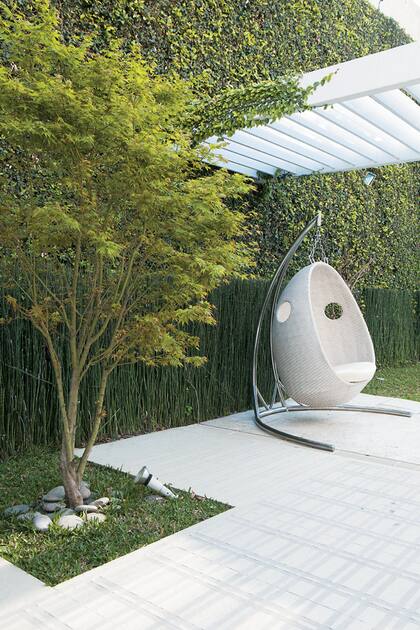 El jardín se proyectó a nuevo con macizos de plantas de corte geométrico. Sobre el solado de porcelanato natural con diseño antideslizante se colocó un asiento colgante en fibra sintética y estructura de acero pulido. La pérgola cuenta con módulos regulables solares suspendidos y esmaltados