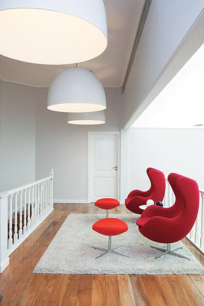Los sillones y las banquetas apoyapies tapizadas en género colorado tipo telar son un diseño del arquitecto Arne Jacobsen (Compañía de Comercio). Las tres campanas colgantes están moldeadas en fibra de vidrio (Iluminación Agüero)
