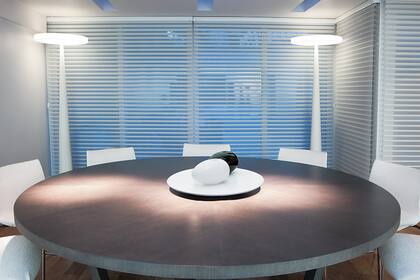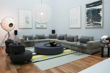 Alrededor de la mesa circular que simula ser un puf grande, se colocaron sillones en módulos, diseñados por Antonio Citterio. La carpeta y la lámpara de pie son de Gris Dimensión