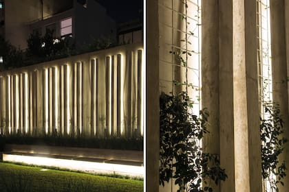 El proyecto de iluminación se concibió a la par del proyecto de paisajismo. Se trabajó el contraluz como propuesta general. El manejo del círculo de chapa terminación óxido como elemento repetido en la medianera logró conectar (al igual que la pileta y el bloque rectangular de ligustro texano) los dos terrenos que conforman este jardín urbano en pleno Palermo. La figura de chapa de 50 cm de diámetro fue diseñada especialmente y por detrás se usaron artefactos económicos y bien chatos con lámparas led que proyectan una luz que rebota en la pared. La textura de la superficie es clave para lograr distintos efectos. En este caso, la filigrana que genera la ampelopsis pelada absorbe más luz que en el otro sector, donde aún no creció. Dos efectos diferentes con la misma calidad lumínica.