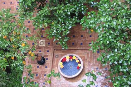 Mi habitación, al igual que las otras, da a un patio lleno de naranjos, en donde solo se escucha el ruido del agua de la fuente, y llegada la tarde es decorada con rosas frescas que flotan y todo el patio es iluminado con faroles típicos marroquíes.