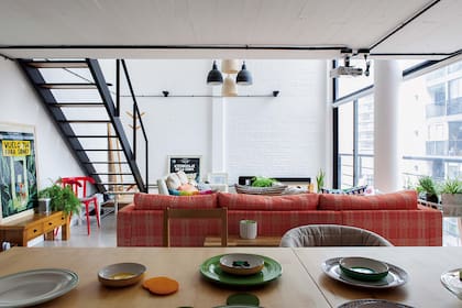 La doble altura se dejó despejada para ser pantalla del cañón en proyecciones que tanto se ven desde el living como desde la mesa del comedor. Este auditorio perfecto se completa con confortables sillones: el naranja en forma de L es de Ikea y el gris acompaña a su dueño desde que se fue de la casa de sus padres, y ya lleva siete mudanzas. En el techo, lámparas galponeras pintadas de negro junto a otras con pantalla de mimbre. A cargo de la ambientación, el estudio Primal supervisó un minucioso trabajo para dejar de punta en blanco lo que era una oscura pared de ladrillo a la vista.