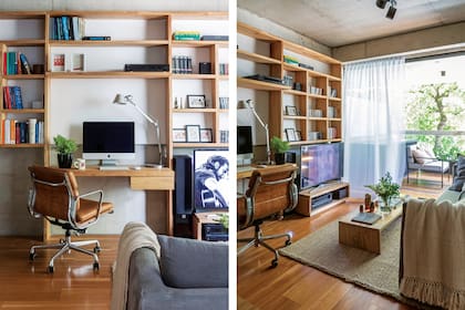 Una genial base giratoria permite ver la tele en el living o del dormitorio, según sea necesario. Esa fue la función que sumó María Luz en este mueble divisor que le permite organizar los espacios, tener privacidad en el dormitorio y bloquear un poco la luz.