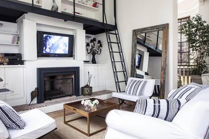 El nicho sobre la chimenea surgió como el lugar perfecto para ubicar la TV, que queda oculta cuando se cierran los postigos colocados ad hoc. El recurso tan elegante está en total sintonía con el estilo de este departamento (ubicado en la cúpula de un edificio histórico) totalmente restaurado por el estudio estadounidense The Alchemists.