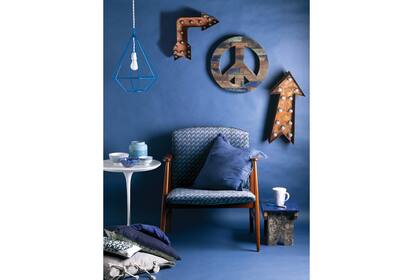 Originales flechas de chapa con luces ($1.200 la chica y $1.800 la grande) y el símbolo ‘Paz’ en madera ($500). Banquito ($450, todo Oldies Deco) y sillón escandinavo ($5.900, La Mersa) con almohadón ($329, Falabella). Más almohadones en el piso: modelo ‘Mini’ ($180), ‘Indie’ bicolor ($280, Texturas Urbanas) y ‘Rope Sailor’ ($460, Hands Off). La nota contemporánea la dan la mesita ‘Tulip’ ($2.550, Fauna) y la lámpara ‘Diamante’ ($790, Pennsylvania Interiorismo).