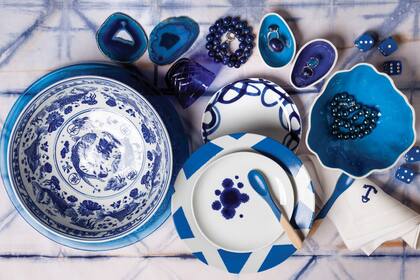 Una vista cenital de la mesa con mantel de gabardina ‘Kashiwa’ teñido ($450, Texturas Urbanas) para un mix de vajilla en tonos de azul. Desde arriba: plato de vidrio ($79, Falabella) y bol de porcelana china ($1.850). En el centro, dos platos de postre pintados con diferentes motivos ($530 c/u, George Home Couture) separados por otro a rayas ($180). Cucharas de madera ($120, Domínguez Home), collares de perlas, anillos de lapislázuli y ónix azul con plata 925 (todo de Fernando Repiso), chapas de ágata natural ($340), un vaso portavela ($64) y dados decorativos ($420 el juego) salpican la escena. Rematan la servilleta bordada ($370, todo de George Home Couture), los bol ‘Zapallo’ ($200) y ‘Mini paltas’ (70 c/u, todo de SUD).