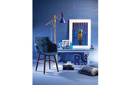 Un espacio singular con piezas de todas las vertientes; líneas contemporáneas en la silla ‘Iruya’ ($3.100, Fauna), gran diseño en la lámpara ‘Lady’ ($3.690, Juan Diciervo Iluminación) y la sencillez de un banco de madera ($890, Easy). Sobre éste, vela Voluspa ($680), fotografía en blanco y negro enmarcada ($380, Domínguez Home), vasos portavelas tallados ($64 c/u, George Home Couture), botella de vidrio con forma de lamparita ($907) y fotografía ‘Libertad condicional’, de Patricia Müller ($14.399, Agnes Deco). En el piso, letras de chapa ‘R’ ($550) y ‘J’ con luces ($1.200, Oldies Deco), taza y plato de té ‘Flores’ ($1.599 el juego completo) y almohadones en lino teñido con técnica de shibori ($280, Texturas Urbanas) y a lunares ($149, Falabella).