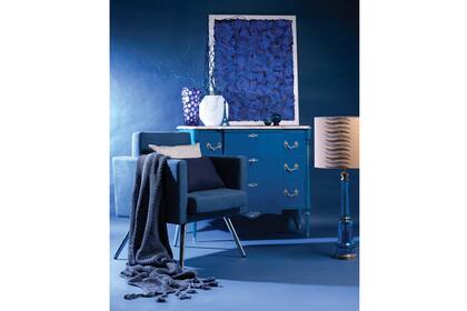 La línea clásica de la cómoda ($11.495) y la lámpara ($3.388, Agnes Deco) se actualiza con los floreros ($5.200 y $1.800, George Home Couture), la Torre Eiffel ($299, Domínguez Home), una obra de Guillermo Giménez y el sillón ‘Fit’ ($7.216, Fauna) con manta ($349, Falabella), almohadón crudo ($460, Hands Off) y otro en lino azul ($360).