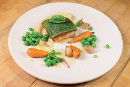 Untar cada pieza de pescado con una capa finita de mostaza y salsa de tomate natural. Colocar encima una lámina de croûte del tamaño del pescado. Agregar fumé de pescado a la base de la fuente. Hornear a 180° C de ocho a diez minutos. Servir con puré de hinojos, arvejas blanqueadas y salteadas en manteca; zanahorias y echalotes confitados.