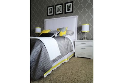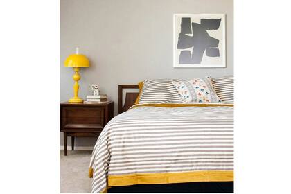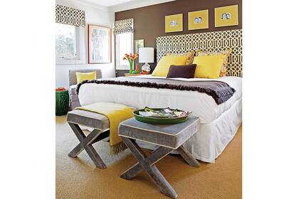 Equilibrada armonía en este dormitorio que conjuga la frialdad del blanco y el gris con los la calidez propia de los tonos tierra y del amarillo en pequeños detalles| Foto: BHG