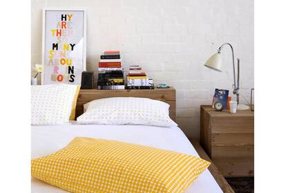Una opción actual y delicada. La presencia del amarillo asoma en el cartel, también aparece en los cantos de los libros y las sábanas. | Foto: Ohmygoshblog