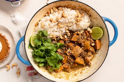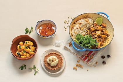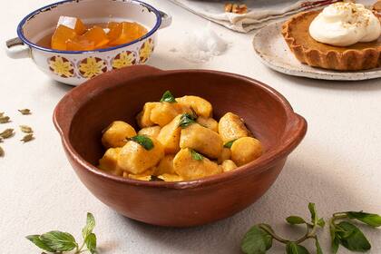 Cocción. "Me encanta hacerlo al horno, para cualquier uso que vaya a darle. Eso permite que el agua del producto se evapore y se concentren los azúcares naturales", explica el cocinero. "En el caso del dulce el zapallo, se pasa primero por una solución de cal viva y agua que permite la formación de una costra crujiente y un centro tierno. Para la tarta dulce, cociné los zapallos al horno con leche, manteca y especias. Para el curry, la cocción fue a la cacerola, y para los ñoquis, también elaboré el puré base partiendo de la cocción en horno. En esta receta es especialmente importante que el puré esté bien seco para que no absorba harina de más y queden duros los ñoquis".