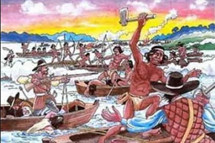 Al fin, el enemigo asomó su rostro y la batalla comenzó. Balsas y canoas avanzaron hacia el frente, precedidas por un cañoncito que vomitaba fuego mortífero entre las filas de bandeirantes y tupíes. Los paulistas no se rendían, pero sus fuerzas menguaban, y el coraje guaraní se mantenía en alto, como el estandarte de San Francisco Javier. Ya sin víveres y cargados de heridos, los invasores comprendieron que la batalla estaba perdida. Adonde dirigieran sus ataques, allí los esperaba la defensa guaraní, convertida en ofensiva. El fervor de la guerra hervía en la sangre de los caciques, que no otorgaban clemencia. Arcos, flechas, hondas, macanas, arcabuces y el temible tambetá, hicieron estragos en las filas del enemigo portugués.