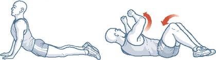 1) Boca abajo, con los brazos flexionados al costado del cuerpo y las palmas apoyadas, estirar lentamente los brazos elevando el tronco sin despegar la pelvis del suelo. Con la cabeza hacia atrás mirar hacia arriba. Mantener 20 segundos y bajar.