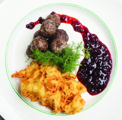 Albóndigas suecas, puré de papas, rúcula y dulce de grosellas rojas y brunsas