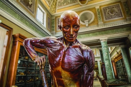 Sí, porque detrás de las puertas de doble hoja, se encontraba un verdadero gabinete de curiosidades o cuarto de maravillas. Enormes anaqueles y vidrieras contienen innumerables ejemplos médicos de todo tipo, piezas de estudio y un amplio espectro de artículos relacionados con el estudio de la anatomía tanto humana como animal. Los techos cubiertos con frescos reflejan los retratos de las eminencias del pasado.