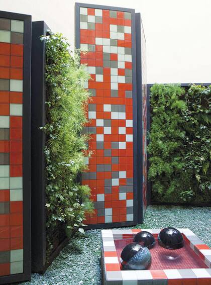 Estructura de azulejos de colores y paneles verdes que se levantan sobre biombos. Una creación de Cristina Le Meauthe
