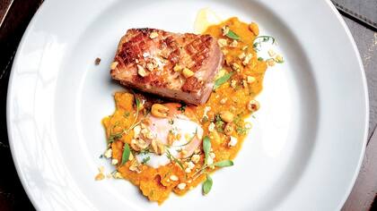 El plato: panceta de cerdo ahumada braseada y locro de kabutia