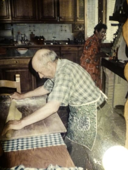 En Le Marque me recibió Lucio, el hijo de Albino, uno de los hermanos de mi abuelo, y me llevó a conocer los terrenos donde trabajaba y vivía mi familia. Tengo una foto en la que Albino cocinaba pastas. En realidad, es la foto de una foto. Está con el mattarello, el palo de amasar y una serie de cuchillos. Como era muy cuidadoso, amasaba la pasta y, para hacerla toda del mismo grosor, la apoyaba sobre un mantel cuadriculado. Entonces la estiraba y después la levantaba y miraba si todos los cuadraditos estaban humedecidos de manera pareja. Si alguno no había quedado bien, significaba que en ese lugar la masa era más gruesa. Aquel mantel centenario fue el que usamos para comer.