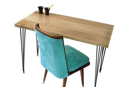Escritorio "Fifty" en madera maciza de 3cm de espesor con terminación hidrolaca semimate color natural y patas de hierro macizo reforzadas. Mide 55x110x75cm de alto, $2.100 (Tienda Quadrat).