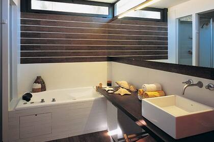 El espejo acompaña a la larga mesada de madera, logrando un efecto de amplitud en este baño angosto.