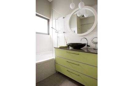 Juego circular: la forma del espejo combina con las lámparas esféricas, la bacha circular y el pequeño espejo redondo que se posa sobre e vanitory. | Foto: Xnet.