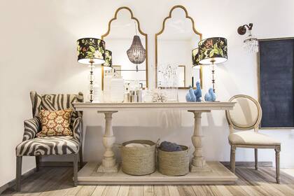 Con contornos | El espejo "Trébol" de Agustina Cerato tiene marco de hierro forjado a mano. Su diseño es de inspiración marroquí y puesto de a dos genera un clima especial en un pasillo o espacio abierto. El lustre es dorado con terminación gastada y mide 120cm x 65cm.