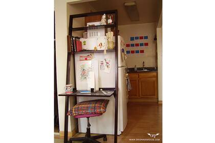 Este es más un escritorio que un estante, pero la solución es muy ingeniosa y se aprovecha el costado de la heladera como imán.| Foto: