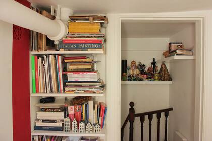 Con esta imagen busco mostrarles que cualquier rincón puede tener un estante, especialmente si tenemos libros dando vueltas por toda la casa. No sólo están los estantes al lado del caño sino los que aparecen dispuestos en "L" sobre la escalera. | Foto:
