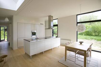 Líneas rectas en esta propuesta casi monocromática; el contrapunto de color viene del afuera, a través de los enormes ventanales que dejan ver el jardín. | Foto: